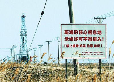 通往斑海豹保護(hù)核心區(qū)的小路上立著警示牌,不遠(yuǎn)處的鐵塔就是一個(gè)鉆井平臺(tái)。