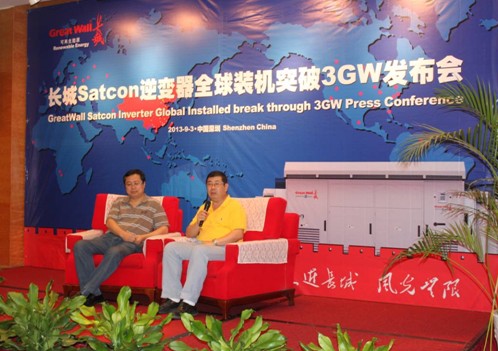 2013年9月3日,深圳市深航國際酒店深航廳人聲鼎沸,深圳中電長城能源有限公司(簡稱長城能源)"長城Satcon逆變器全球裝機量突破3GW"新聞發(fā)布會在這里隆重舉行。來自太陽能、電力等領(lǐng)域的專家、領(lǐng)導(dǎo)齊聚一堂,共同見證了這一歷史時刻。長城電腦總裁兼長城能源董事長、總裁周庚申等領(lǐng)導(dǎo)共同出席了此次發(fā)布儀式。