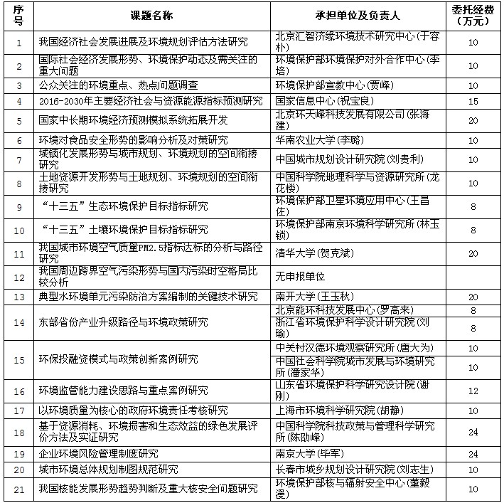 按照環境保護部關于國家環境保護“十三五”規劃編制研究的總體部署,環境保護部規劃財務司、環境保護部環境規劃院聯合對部分重點問題研究課題面向社會公開選聘承擔單位,在中國環境報、環境保護部網站、環境規劃院網站和中國環境規劃網上刊登了公開選聘承擔單位的消息和申報指南。國內高校、科研機構、地方單位和企業共提交申報書88份,涉及20個課題。日前環境保護部規劃財務司、環境保護部環境規劃院聯合組織召開專家評審會,在駐環境保護部紀檢組監察局的監督下,進行了公開、公平、公正的評審,現將國家環境保護“十三五”規劃部分重點問題研究課題公開選聘結果予以公告(附后)。環境保護部環境規劃院將依據專家意見和課題需求,進一步與課題承擔單位明確課題研究的技術要求,確定課題實施方案,全面啟動研究工作。對于未入選的其他申請團隊,環境保護部規劃財務司、環境保護部環境規劃院將邀請團隊負責人作為專家參與相關課題咨詢、評審和研討,積極為國家環境保護“十三五”規劃編制獻計獻策。環境保護部規劃財務司、環境保護部環境規劃院衷心感謝社會各界對國家環境保護“十三五”規劃編制工作的關注和支持。