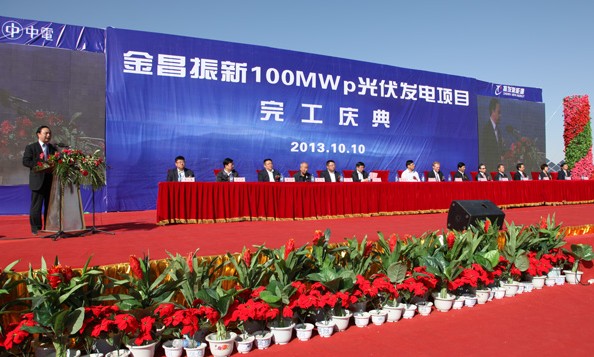 金昌振新100兆瓦光伏發電項目是金昌市在甘肅省第十八屆蘭洽會上簽約的新能源產業發展重點招商引資項目之一,由香港中電集團和振發新能源集團共同出資興建,項目占地6306畝,總投資約12.45億元。該項目采用國內最先進的斜單軸自適應對日跟蹤光伏發電裝置,擁有自主知識產權和專利技術,發電量比固定式同規格光伏電站提高30%左右,是目前全球規模最大的自適應對日跟蹤光伏電站。截至目前,振新100兆瓦光伏發電項目已全部建成,并于2013年7月1日并網發電,累計發電量超過5800萬度。