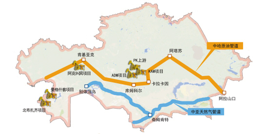 全長2830公里的中哈原油管道,經(jīng)阿拉山口直接通往中國的煉油廠。起自土庫曼斯坦、全長1794公里的中亞天然氣管道,在哈薩克斯坦境內(nèi)約1300公里,經(jīng)南部的江布爾州,穿越阿拉山口將“藍金”送到中國的千家萬戶。而中國石油在與哈薩克斯坦的能源合作中,截至2012年底,累計上繳稅費230多億美元,公益事業(yè)支出2.5億美元以上,提供就業(yè)崗位2.8萬多個。