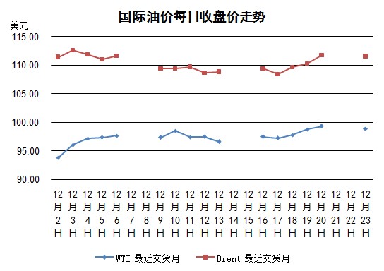 由于圣誕節(jié)來臨,在連日上漲之后部分交易者選擇落袋為安,因此當(dāng)日紐約WTI、倫敦布倫特價(jià)格都有小幅下降。但是目前導(dǎo)致油價(jià)上漲的不安因素仍未消除:法國道達(dá)爾三座煉廠工人持續(xù)罷工、利比亞石油出口減少約100萬桶/日(當(dāng)?shù)赜形溲b組織在尋求更大的自治權(quán))、南蘇丹動(dòng)亂導(dǎo)致其24.5萬桶/日的石油產(chǎn)量受到威脅等(中石油已經(jīng)將工人從油田撤出)。