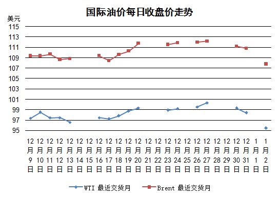 1月2日國際石油期貨價格大跌。美元當日對歐元走強,以美元定價的原油價格給人以較高的感覺,促使油價下行。另外,中國國家統計局公布的12月PMI數據低于前一月,這也利空油價。美國經濟數據空多交織,首次申請失業保險人數比前一周小幅改善,減少2000人至33.9萬人,但美國供給管理協會公布的12月美國制造業PMI為57.0,低于前一月的57.3。