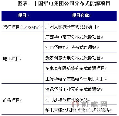 前瞻網(wǎng)分布式能源研究報告顯示,國內(nèi)從事分布式能源投資的發(fā)電集團主要是我國的五大發(fā)電集團,即中國華能集團公司、中國大唐集團公司、中國華電集團公司、中國國電集團公司、中國電力投資集團公司。其中,華電集團是我國天然氣分布式能源項目起步最早,開發(fā)項目最多的發(fā)電企業(yè),同時,公司還積極發(fā)展風(fēng)電、太陽能發(fā)電、生物質(zhì)發(fā)電、小水電等其它類型的分布式能源。華電集團已取得天津、上海、廣東等十幾個省區(qū)近100萬千瓦分布式能源核準(zhǔn)批復(fù),占全國的三分之二。其典型項目如下: