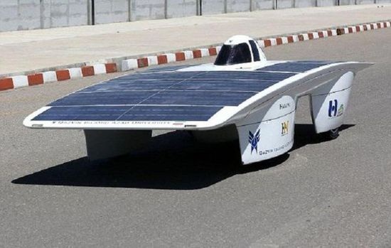 一個(gè)由伊朗大學(xué)生組成的團(tuán)隊(duì),正準(zhǔn)備讓他們?cè)O(shè)計(jì)的Havin-2太陽(yáng)能車參加7月份在美國(guó)舉辦的太陽(yáng)能挑戰(zhàn)賽。他們希望借此機(jī)會(huì)展示他們的研究成果。這輛 Havin-2太陽(yáng)能車4.5米長(zhǎng)的碳纖維底盤(pán)使它看起來(lái)就像一個(gè)巨大的門(mén),隱藏在不規(guī)則白色車身下的四個(gè)車輪成為證實(shí)它是一輛汽車的唯一證據(jù)。