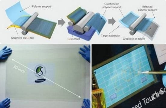 由于石墨烯柔韌、透明且可以導電的特性,相比傳統玻璃,它更適合作為屏幕面板。包括美國德克薩斯大學、韓國成均館大學均在早期進入此領域進行研究,并取得了一定的成功;而科技公司方面,三星在2011年已經研發出40英寸的石墨烯觸摸屏面板、索尼則在2012年進一步將其柔性化。