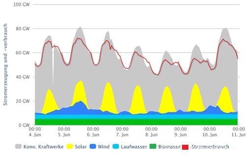 黃線是光伏,藍(lán)線是風(fēng)力,灰色是總體發(fā)電出力,而紅線就是德國總體的電力負(fù)荷需求。不難看出,6月9日就光伏出力而言并不是最高,才剛剛超過23GW,之前的6月5日和前不久的7月3日絕對數(shù)量上都有超過。而之所以引人注目以6月9日作為標(biāo)桿,是因?yàn)橄啾戎逻@天的電力負(fù)荷非常低,所以才使得光伏發(fā)電所占比例凸顯。