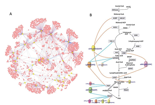 圖1 (A) 計算方法預(yù)測的微擬球藻全基因組轉(zhuǎn)錄調(diào)控網(wǎng)絡(luò),黃點代表轉(zhuǎn)錄因子,紅點代表靶基因。(B) 甘油三酯(TAG)合成途徑的轉(zhuǎn)錄調(diào)控網(wǎng)絡(luò),彩色圓柱體代表轉(zhuǎn)錄因子,紅線代表正調(diào)控,藍(lán)線代表負(fù)調(diào)控。