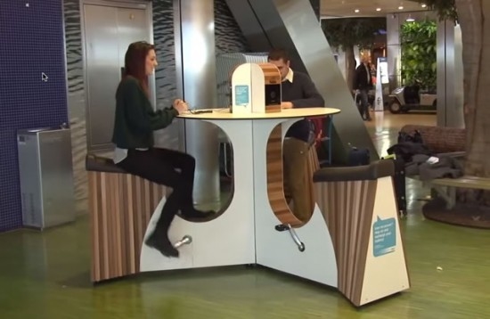 在荷蘭阿姆斯特丹市郊的機場、法國里昂的火車站有這樣一種“桌椅”,可以讓你在候機、等車的時候順便鍛煉身體,還能給手機充電。