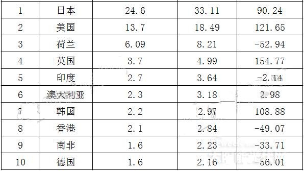 根據(jù)相關(guān)數(shù)據(jù),2014年1-6月份日本出口額達(dá)24.6億美元,美國13.7億美元,荷蘭6.09億美元,英國3.7億美元,印度2.7億美元,澳大利亞則為2.3億美元。