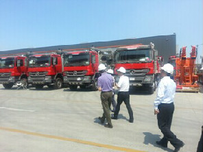 交流結束后,杰瑞市場部工作人員帶領中國能源網一行人員參觀了裝備制造車間,車間外停滿了各種各樣的石油裝備,有的正準備發給客戶。進入車間,所有人員都帶上了安全帽和防護眼鏡,在市場部的講解中一路參觀了壓裂車、混砂車、LNG設備組裝等車間,看到了工人們緊張忙碌的情景。