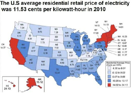 美國各地電費不同,有的地方便宜,一度電(kilo watt hour,簡寫kWh)6美分多。少數(shù)地方較貴。最貴的是夏威夷,一度電24美分多。全美國的平均電費是11.53美分。平均每家每月用電接近1千度。