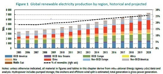 圖:全球不同地區(qū)可再生能源發(fā)電量歷史數(shù)據(jù)及預(yù)測(cè)