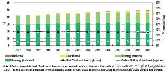全球可再生能源供熱(包括傳統(tǒng)生物質(zhì)燃料)到2020年預(yù)計(jì)將達(dá)到49.7EJ[1](每年1%的增長率)。以此同時(shí),由于城鎮(zhèn)化和現(xiàn)代供能手段的發(fā)展,傳統(tǒng)生物質(zhì)能源的使用量在大多數(shù)費(fèi)OECD國家中將大幅減少,新型可再生能源供熱量將由2013年的14.5EJ增長到2020年的17.9EJ.