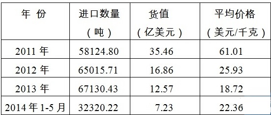 從表1可以看出,我國多晶硅硅料進口以每年5%-12%左右的幅度增長,貨值下降26%-52%,呈量增價減的趨勢;2011年-2013年,多晶硅硅料價格呈逐年下降趨勢,特別是2012年起價格下降幅度較大,一定程度上說明自2012年以來國外以低價大幅向我國傾銷多晶硅硅料。