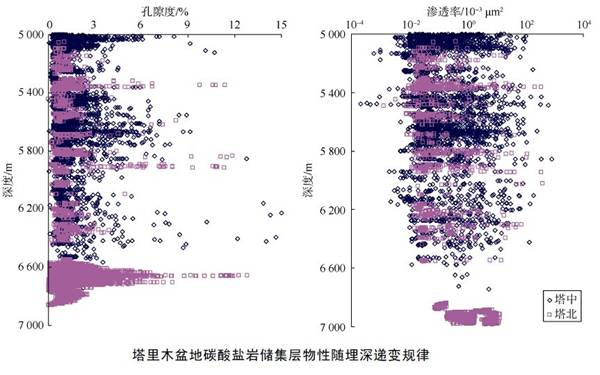 礁灘、白云巖、風化殼型儲集層是碳酸鹽巖中最重要的儲集層,其最大特點是次生孔隙發育。從儲集層物性隨深度演化關系看(見圖),總體上孔隙度和滲透率較為穩定。