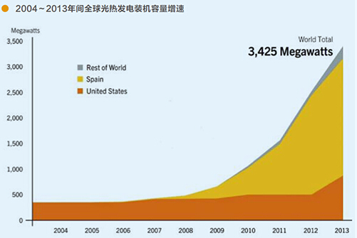 目前,常規可再生能源水電、光伏發電、風力發電等發電技術都存在季節性、間歇性、穩定性的問題。光熱發電與儲熱系統或火力發電結合,可實現連續穩定發電,具有可調節性,易于并網,并且全生命周期內環境影響較小。光熱無需無功補償、電能質量高。故近十年來光熱發電發展步伐迅速,尤其以太陽能資源豐富的美國、西班牙兩國,無論在技術上還是商業化進程,都在全球位列前茅。可再生能源政策網絡發布了全球可再生能源2014年現狀報告,對光熱發電發展現狀進行了研究與分析。報告顯示截止2013年底,全球光熱發電實現已投產裝機容量與2012年相比新增近90萬千瓦,增幅達36%,光熱發電已投產裝機總容量超過340萬千瓦。十年間光熱發電的投產裝機容量增長了近10倍。從2008年底到2013年底的5年間,全球光熱發電裝機容量年均增速保持在50%左右。