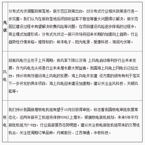 關注標的:隆基股份(分布式市場啟動,單晶技術具備高轉換效率優勢,有望獲得推廣)、彩虹精化(轉型分布式光伏運營領域,主要優勢在華南地區)、中天科技(從事江蘇省分布式建設)、華光股份(與股東無錫國聯攜手建設分布式光伏)、森源電氣(河南省分布式光伏龍頭企業)等。