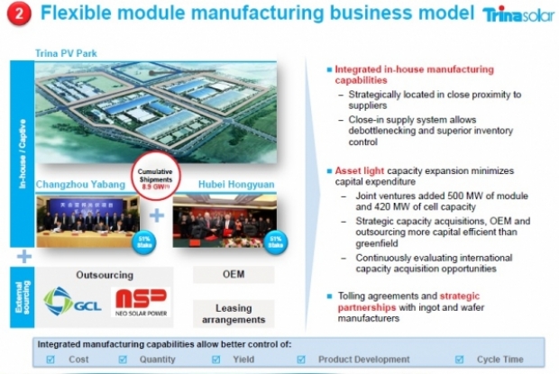 天合光能因此利用OEM、外包以及資產租賃的使用,填補其硅片切割和太陽能電池產量與組件的缺口。