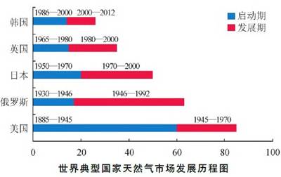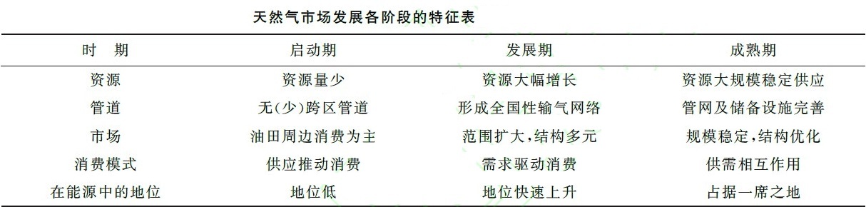 對天然氣市場而言,從美國、英國、日本、俄羅斯等成熟國家的發展經驗看,一般都經歷了啟動期、發展期、成熟期3個階段。天然氣市場發展各時期在資源、管道、市場、消費模式以及在能源消費中地位的特征詳見表。