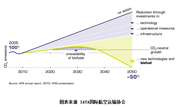以下圖表顯示的是國際航空運輸協會(IATA)的二氧化碳減排戰略,計劃在2005年到2050年期間減少一半的排放量↓↓↓