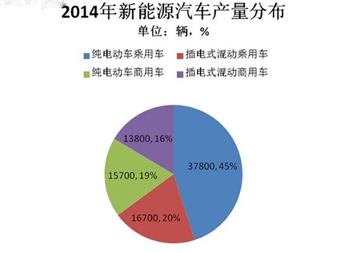 2014年,有新能源汽車元年之說(shuō),總體產(chǎn)銷都較往年有大幅增長(zhǎng)。最終在新能源汽車市場(chǎng)上,純電動(dòng)商用車成為增速最快車型。2014年全年純電動(dòng)商用車生產(chǎn)1.57萬(wàn)輛,占總體產(chǎn)量的19%。