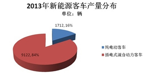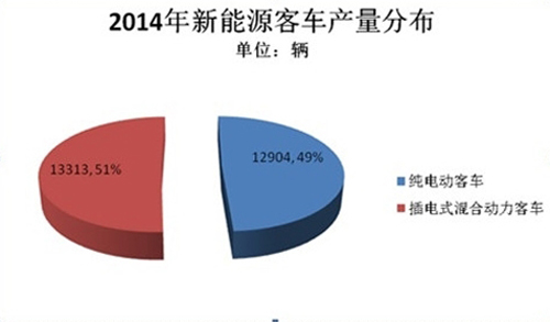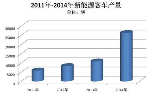 2014年,中國(guó)新能源客車產(chǎn)量為26217輛,比上一年增長(zhǎng)1.42倍,2014年的產(chǎn)量超過(guò)了此前幾年生產(chǎn)的新能源客車總和。其中純電動(dòng)客車12904輛,比上一年增長(zhǎng)6.54倍,插電式混合動(dòng)力客車13313輛,比上一年增長(zhǎng)8.93倍,傳統(tǒng)混合動(dòng)力客車1193輛,比上一年減少86%。由于傳統(tǒng)混合動(dòng)力汽車被排除在新能源汽車之外,混合動(dòng)力客車產(chǎn)量也大幅萎縮,2014年的新能源客車的統(tǒng)計(jì)數(shù)據(jù)也沒有包括傳統(tǒng)混合動(dòng)力客車。