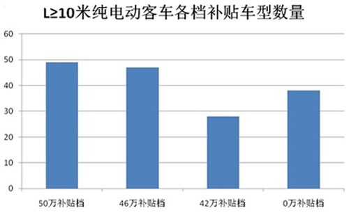 在前三批入選免購(gòu)置稅目錄的224款純電動(dòng)客車中,車長(zhǎng)為6米≤L<8米這一檔,滿足Ekg<0.5的車型有40款,每臺(tái)車能夠拿到該類別30萬(wàn)的最高標(biāo)準(zhǔn)補(bǔ)貼,滿足0.5≤Ekg<0.6的車型有4款,能夠拿到26萬(wàn)的補(bǔ)貼,而滿足0.6≤Ekg<0.7的車型有2款,能夠拿到22萬(wàn)的補(bǔ)貼,另外還有6款車單位載質(zhì)量能耗量超過(guò)0.7,則拿不到國(guó)家補(bǔ)貼;車長(zhǎng)為8米≤L<10米這一檔,滿足Ekg<0.3的車型有7款,每臺(tái)車能夠享受該類別40萬(wàn)的最高標(biāo)準(zhǔn)補(bǔ)貼,滿足0.3≤Ekg<0.4的車型有2款,能夠拿到36萬(wàn)的補(bǔ)貼;而車長(zhǎng)為L(zhǎng)≥10米這一檔,滿足Ekg<0.3的車型有49款,每臺(tái)車能夠享受該類別50萬(wàn)的最高標(biāo)準(zhǔn)補(bǔ)貼,滿足0.3≤Ekg<0.4的車型有47款,能夠拿到46萬(wàn)的補(bǔ)貼,而滿足0.4≤Ekg<0.5的車型有28款,能夠拿到42萬(wàn)的補(bǔ)貼,另外還有38款車單位載質(zhì)量能耗量超過(guò)0.5,拿不到國(guó)家補(bǔ)貼。