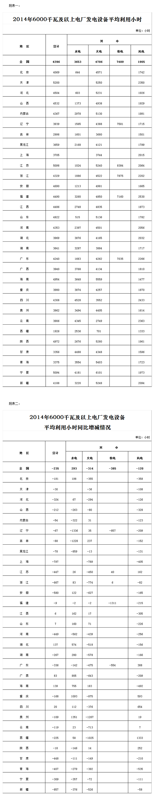 2014年全國(guó)6000千瓦及以上電廠發(fā)電設(shè)備平均利用小時(shí)及同比增減情況分別見(jiàn)附表1和附表2。