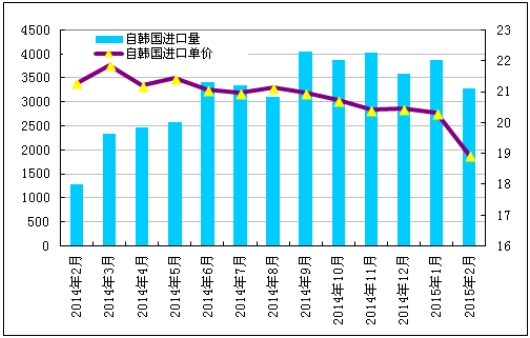 2015年2月份從韓國進口多晶硅量減少至3286噸,環比減少15.0%;2月份進口單價小幅下滑至18.95美元/千克,環比降幅為6.7%。
