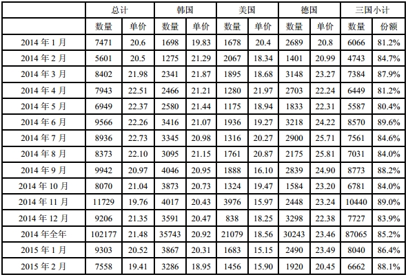 2015年2月份從德國進口多晶硅量減少至1920噸,環比降幅為22.9%;2月份進口單價小幅下滑至20.45美元/千克,環比下滑為12.9%。