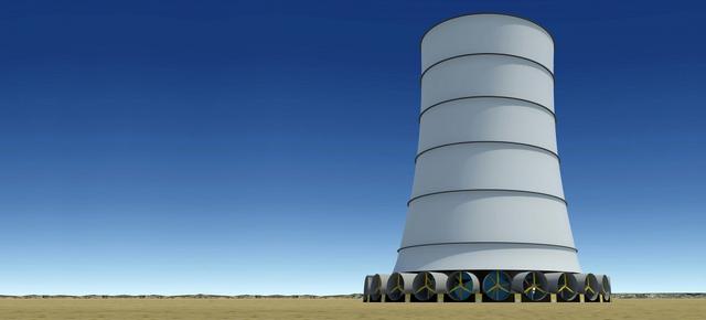 該公司設計的“下降氣流塔”(DowndraftTower)非常簡單,首先在炎熱、干燥的地方建造一個矩形空心圓柱塔,高度超過2200英尺,直徑超過1200英尺。(大約比全球最高的迪拜哈利法塔低了500英尺。)然后將水抽到頂部,向里噴入霧氣。這些霧氣會冷卻上升的熱氣流,加大重量后使之在塔內向下流動,從而創造出時速50英里的人造風,推動安裝在塔底的渦輪轉動。