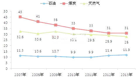 據(jù)統(tǒng)計,我國傳統(tǒng)能源形勢十分嚴(yán)峻。從下圖可以看出,我國的煤炭的儲采比呈逐年下降趨勢,由2007年的45年下降至2013年的31年;石油的儲采比有所上升,截至2013年底,我國的石油儲采比為11.9年;天然氣的儲采整體呈下降趨勢,2013年為28年。我國開發(fā)新能源已經(jīng)刻不容緩。
