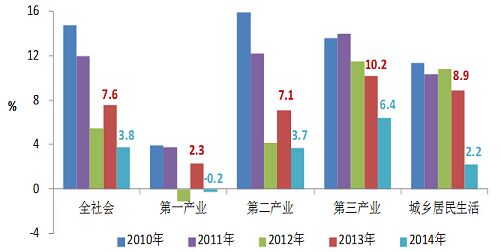 圖1 2010-2014年全社會及各產業用電量增長情況圖