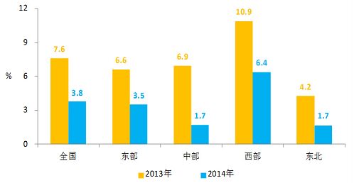 圖2 2013、2014年各地區用電量增長情況圖