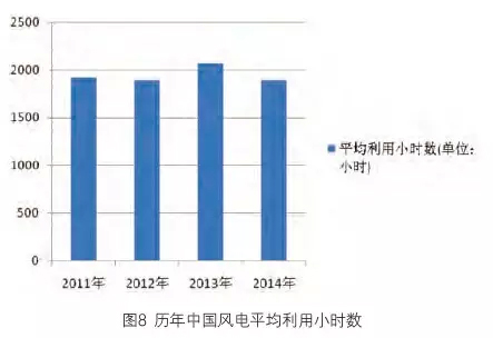 2014年中國的風電平均利用小時數與2013年相比有明顯下降(圖8),為1893小時,同比下降約180小時。主要原因是全國來風情況普遍偏小,全國陸地70米高度年平均風速約為5.5米/秒,比往年偏小8%-12%。風電平均利用小時數最高的地區是云南2511小時,最低的地區是西藏1333小時。