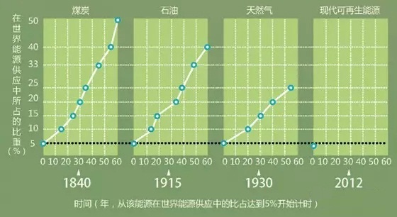 “可再生能源將以不可阻擋之勢席卷全球,”1976年,著名的新能源倡議者艾默里·洛文斯(Amory Lovins)曾這樣斷言。然而,1990~2012年,化石燃料在全球能源消耗中的占比幾乎沒有變化,僅從88%降到了87%。2011年,美國可再生能源在能源供應中占比不到10%,而且大部分來自“傳統”的可再生能源,如水力發電、燃燒伐木過程產生的木材廢料。