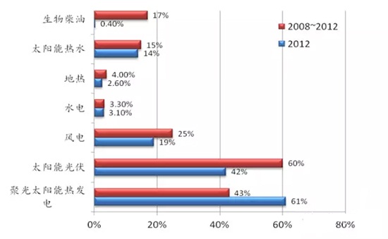 2008年以來,太陽能、風電等可再生能源領域發展迅速。2008~2012年,太陽能光伏裝機年均增長率在60%左右;聚光太陽能熱發電裝機年均增長40%左右;風電裝機年均增長約25%;生物質柴油產能年均增長17%左右;水電發展相對穩定,年均增長3~4%。