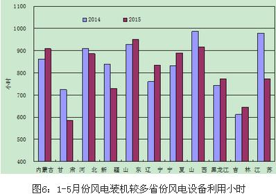 分類型看,1-5月份,全國水電設備平均利用小時1142小時,同比提高57小時;水電裝機容量超過1000萬千瓦的7個省份中,湖南、青海和云南同比分別下降179小時、31小時和9小時,湖北和四川同比分別增長140小時和30小時,貴州、廣西同比分別提高458小時、380小時。全國火電設備平均利用小時1813小時,同比下降186小時,降幅比2014年同期擴大169小時;其中青海2493小時,海南、寧夏、江蘇、江西、河北、陜西和貴州超過2000小時;云南和西藏火電設備利用小時低于1000小時,分別為878小時和48小時;與上年同期相比,共有27個省份火電利用小時同比下降,其中,北京、云南、寧夏、四川和重慶下降超過400小時。全國核電設備平均利用小時2793小時,同比下降49小時。全國風電設備平均利用小時857小時,同比下降6小時。