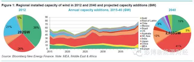 在全球電力市場中,持續(xù)下降的風(fēng)電度電成本促使風(fēng)電在總裝機中的份額不斷提高。彭博新能源預(yù)計,從2014年到2040年,風(fēng)電累計裝機會從366吉瓦上升至超過2,000吉瓦。我們對風(fēng)電市場的預(yù)測可以總結(jié)為以下幾點: