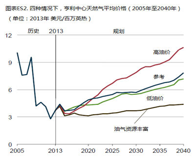 天然氣價(jià)格的預(yù)測(cè)受到油價(jià)、資源可用性和天然氣需求假設(shè)的影響。在參考情況下,亨利中心天然氣現(xiàn)貨價(jià)格(2013版美元)從2015年3.69美元/百萬(wàn)英熱(Btu)上漲到2020年的4.88美元/百萬(wàn)英熱和2040年的7.85美元/百萬(wàn)英熱(圖ES2),國(guó)內(nèi)市場(chǎng)和國(guó)際市場(chǎng)需求的增加加速了這種日益昂貴資源的生產(chǎn)。
