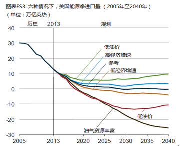 在《2015年度能源展望》中,美國(guó)能源進(jìn)口和出口從2028年開始達(dá)到平衡。在高油價(jià)及石油和天然氣資源較豐富的情況下,隨著美國(guó)原油和干燥天然氣產(chǎn)量增加及進(jìn)口量的降低,美國(guó)將在2019年成為能源凈出口國(guó)。相反,在低油價(jià)情況下,到2040年,美國(guó)仍然是一個(gè)能源凈進(jìn)口國(guó)(圖ES3)。