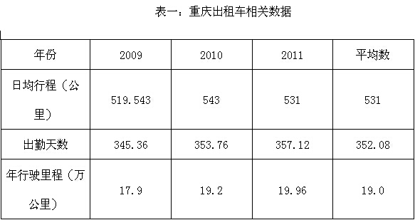 為了支持上述結論,不妨看看西安和重慶兩市的相關數據。據西安出租車管理辦公室公布,西安出租車的保有量為12106輛,每天需用天然氣48萬立方米,日均行程為459公里。按出租車出勤天數為350天計,可推算出其百車公里平均氣耗為8.63立方米。每年每車用氣1.387萬立方米,全市出租車全年氣耗為1.679億立方米。重慶市出租車的日均行駛和年行駛里程及出勤天數見下表: