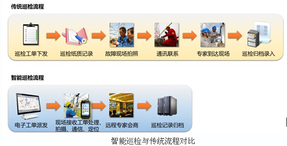 而智能巡檢流程基于電力物聯網發展的無線通信解決方案。巡檢中心遠程派發電子工單到巡檢人員智能終端,作業人員到達現場后終端實現GPS上報定位信息,根據檢修任務逐條執行現場作業,執行巡檢任務同時可開啟攝像頭回傳作業視頻圖像,并可與巡檢中心語音互通,遇到設備故障點可通過智能終端與遠程專家音視頻互通聯合會商解決,巡檢作業結束后記錄自動上傳歸檔,大幅簡化過去復雜的巡檢流程。