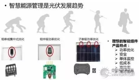 第三個方面,我想簡要談一下智能化組件,我們關注到,組件失配的短板效應,其實只發生在失配很嚴重的情況下,這個圖說明了只有在填充因子FF越大,其失效的短板效應月明顯。智能組件,需要一步一步優化,主要有組串或集中式優化,組件級功率優化,子串級功率優化幾個階段的產品,由于成本因素,需要分別開發和應用推廣。這里做了一個在50%輻照遮擋的情況下,有優化器和普通不帶優化器的組件功率的IV曲線,其最大輸出功率的區別是很大的。最大可以達到20%的差別。