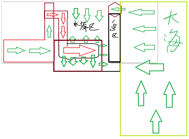海濱水電城模式的各項要件都可以是動態的,甚至包括大壩高度,都可以按我們人類的理想去設計,這個模式給我們的條件真是太優越了。為什么這么說?眾所周知,大壩高度和入口水量是決定發電量的兩大核心要素。而在我這個模式里,這兩大要素都可以隨我們自由控制。我們可以設計大壩有100米的高度,也可以有200米的高度甚至更高(可以挑戰人類向下挖掘的深度),這都不是大問題,因為水庫可以如上圖一樣與大海相連,根據水平原理,排入一號區水庫就等于是排入了大海。對不對?(另外,下面將會提到很重要的一點,根據同等水深水的壓強相等原理,內外環境的壓強實際上抵消掉了,外力直接打擊成了排水的主動力,這里暫且不提)。注意,一號區位置是海濱水庫區的海堤,上面多棱進水口將大海與庫區連成一體,并且多棱口其實是一個大型高吊水閘裝置,如果水庫出了問題,可以隨意關閘控制。這樣的設計,就使我們的大壩高度有了充分的彈性,因為無論大壩多高,水庫都可以比壩高更低,即使再低也沒有問題,因為我們的水庫區與大海水面其實是連成一體的,并不是真的藏身海底。這意味著什么?這意味著,我們可以很好地解決土巖滲透這個大難題,可以在距離大海一個比較適當的位置上建設海濱水電城,距離的遠近完全由我們自己決定。是不是這樣呢?如此一來,我們也可以有大面積的水域搞水產養殖和旅游產業,甚至為望海別墅房地產大開發營造了優美的水天環境基礎。