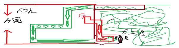下圖是一個單庫“連排連注”模式示意圖,進氣方向(紅色箭頭)可以與注水方向保持完全一致,順流而擊,這樣一來,就可以不關進水口,只要保持一定節奏感和固定頻率的打擊就行了。水庫一滿立即打擊,一點兒不會耽誤連續注水,并且排水速度遠遠大于入水速度。