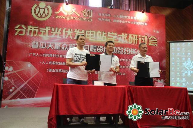 此次人人創股權投融資平臺聯合順德中山大學太陽能研究院,正是借助全國首個眾籌分布式光伏發電站項目——“中天星工廠式光伏發電站項目”融資成功的契機,成功舉辦“[人人創]分布式光伏發電站學術研討會暨中天星眾籌項目融資成功簽約儀式”,現場為我們解讀眾籌新模式的出現如何破局光伏產業的融資困境,并與專家學者們一同探討分布式光伏電站的全新發展模式,開啟人人創助力小微企業轉型發展的新路子。