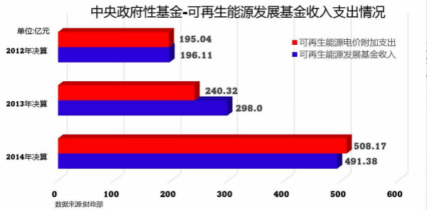 能豆君:2014年中央財政可再生能源發展基金收入的基金只有不到500億元的規模,相比高速增長的可再生能源裝機,基金的缺口越來越大。