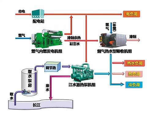 據(jù)介紹,能源站位于南濱路市出版?zhèn)髅絼?chuàng)意中心地下,共分兩層,其上層為燃?xì)饫錈犭娙?lián)供設(shè)施,為該區(qū)域提供電力,冷、熱空調(diào)和熱水,并為能源站下層的“水空調(diào)”—江水熱源泵供電,“水空調(diào)”則通過抽取長江水,來靈活調(diào)節(jié)和平衡區(qū)域的冷熱溫度。夏季,燃?xì)庠O(shè)施為區(qū)域供冷,“水空調(diào)”則通過熱交換,將建筑物中的熱量“取”出來,釋放到長江水中。冬天能源站的運(yùn)作方式與夏天相反。由于結(jié)合了冷熱電三聯(lián)供與“水空調(diào)”的優(yōu)點(diǎn),能源站比中央空調(diào)等傳統(tǒng)供能方式節(jié)約供能成本超過35%。